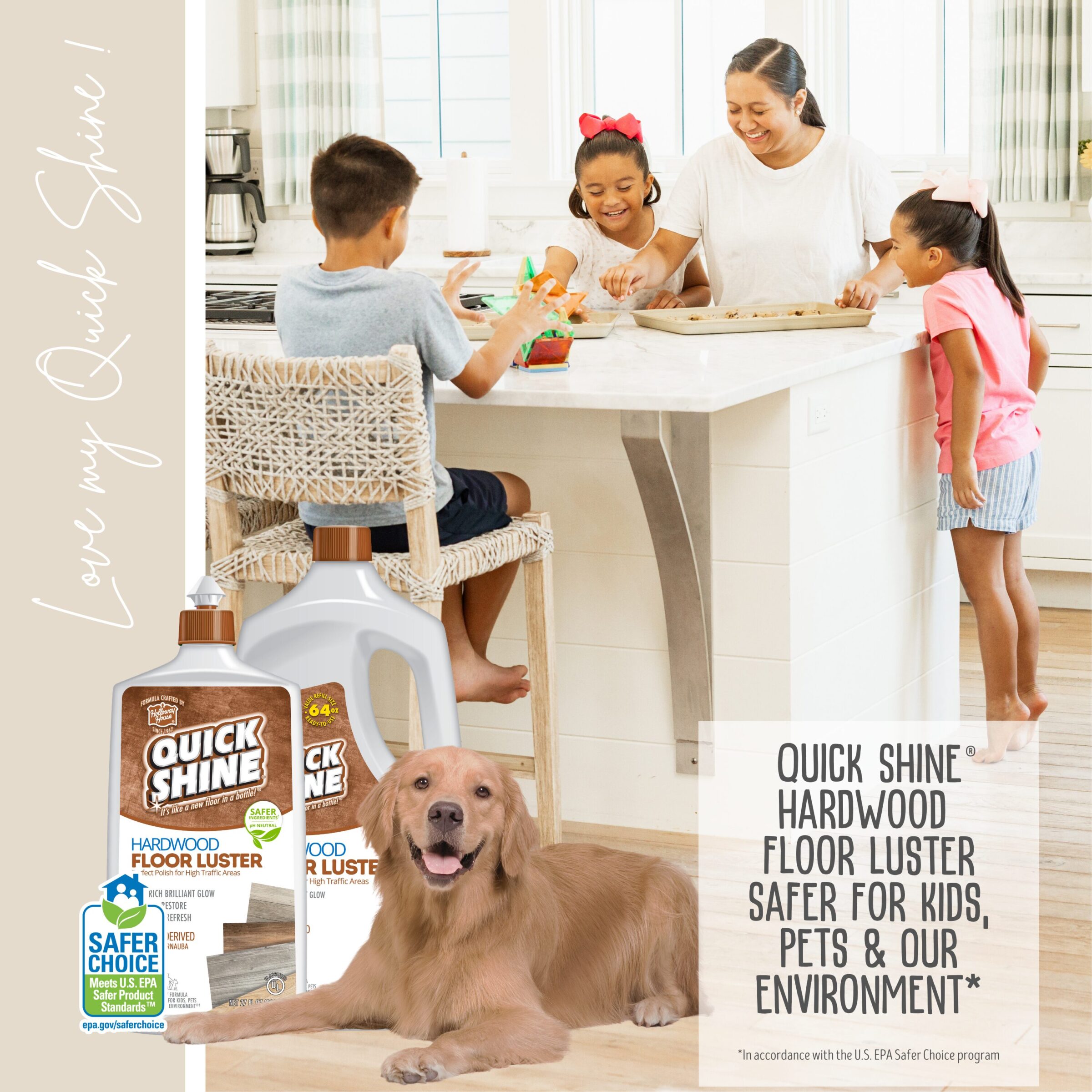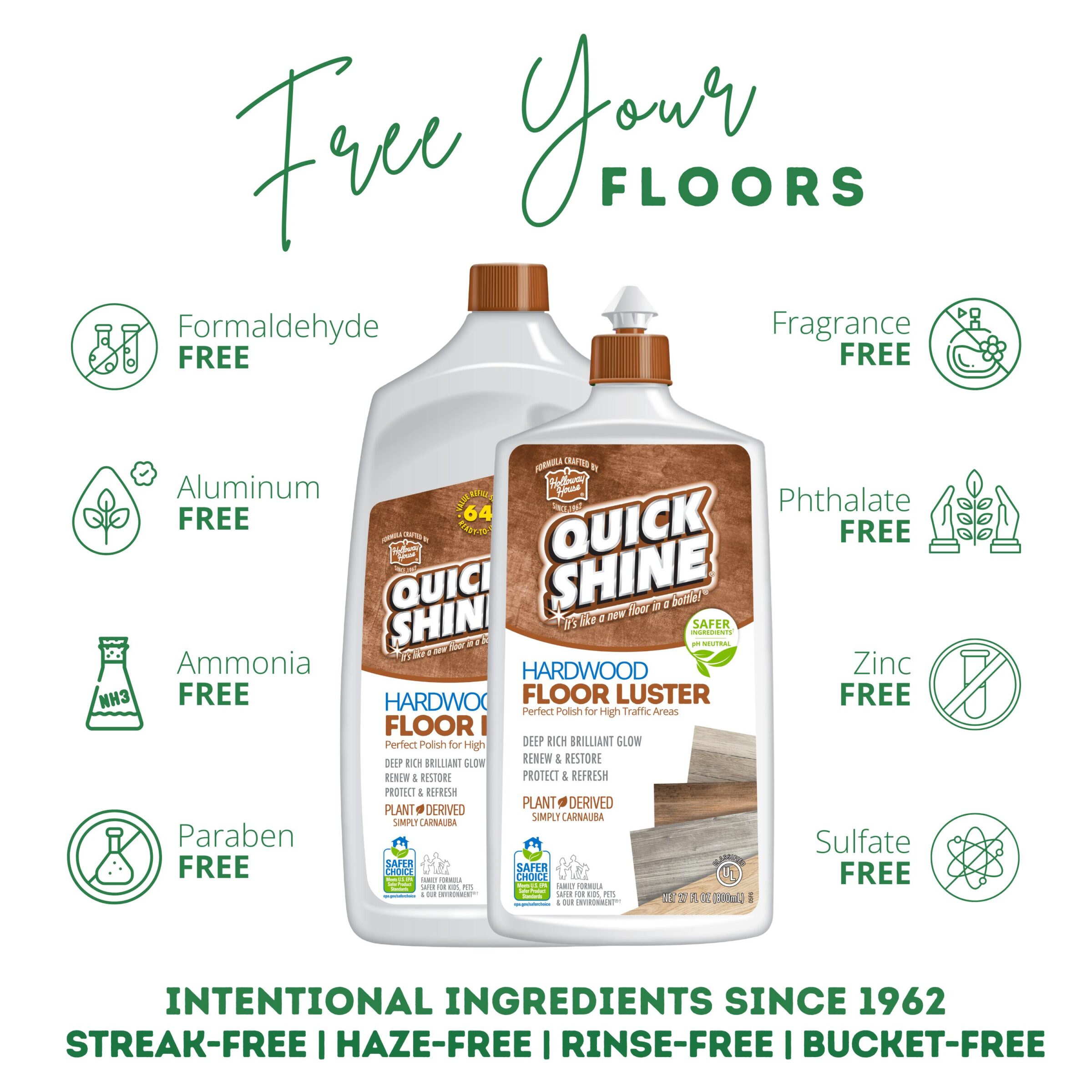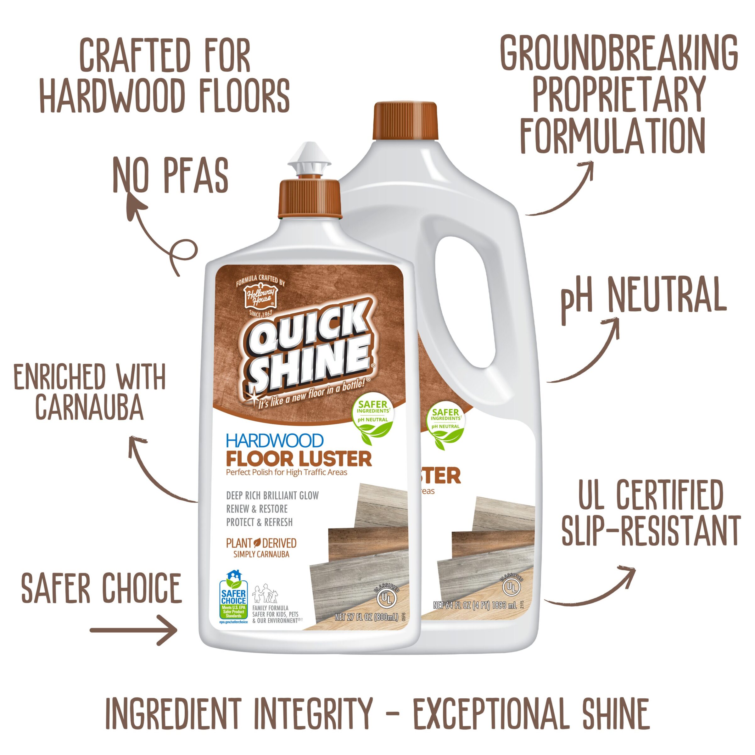 What a beautiful finish with very little effort. This week I set out to hand scrub and “wax” my first floor hardwoods that looked dull and dirty. Washed and wiped the floor and reached in the cabinent and found Quick Shine for high traffic hardwoods…I usually use Bruce, but thought I’ll use this up first. Well I did a substantial portion of the floor before I ran out. So I used the Bruce next…side by side there’s no contest. Bruce made my prepped floor look dull and old next to Quick Shine with its beautiful gloss and like new floor finish. Soooo after several choice words, I threw the other one in the trash and ordered a large container of Quick Shine. Do yourself a favor. Your hard work should produce beautiful results.