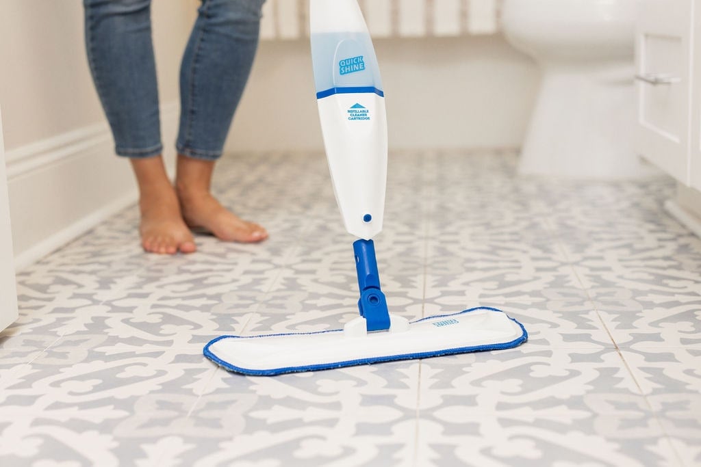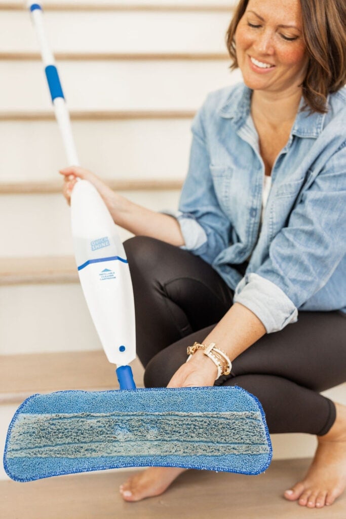 Dampen your microfiber mop pad, spray Quick Shine® Multi-Surface Floor Cleaner in the Quick Shine® Multi-Surface Spray Mop (or squirt from the bottle in an “S” pattern) and clean! Rinse pad frequently every few sections to help avoid any streaking.