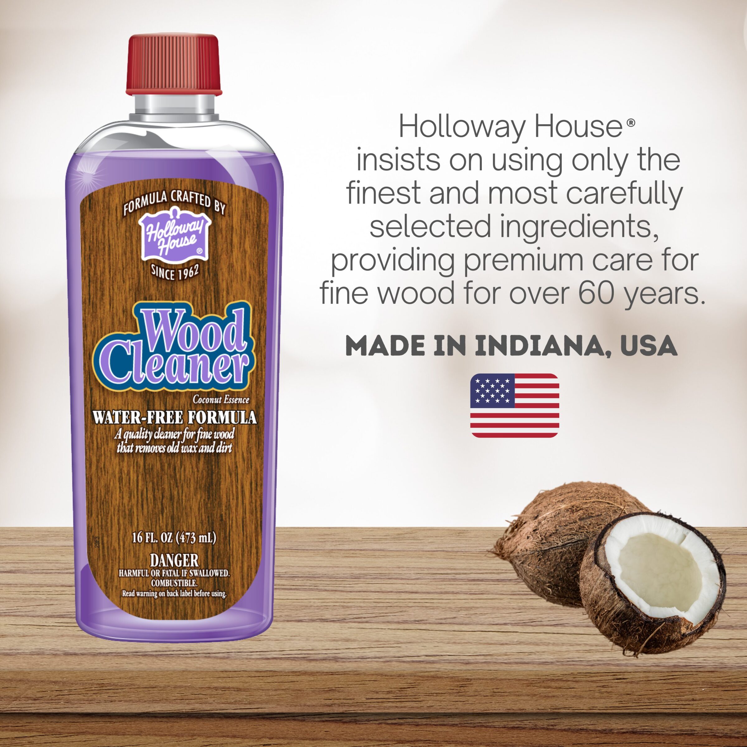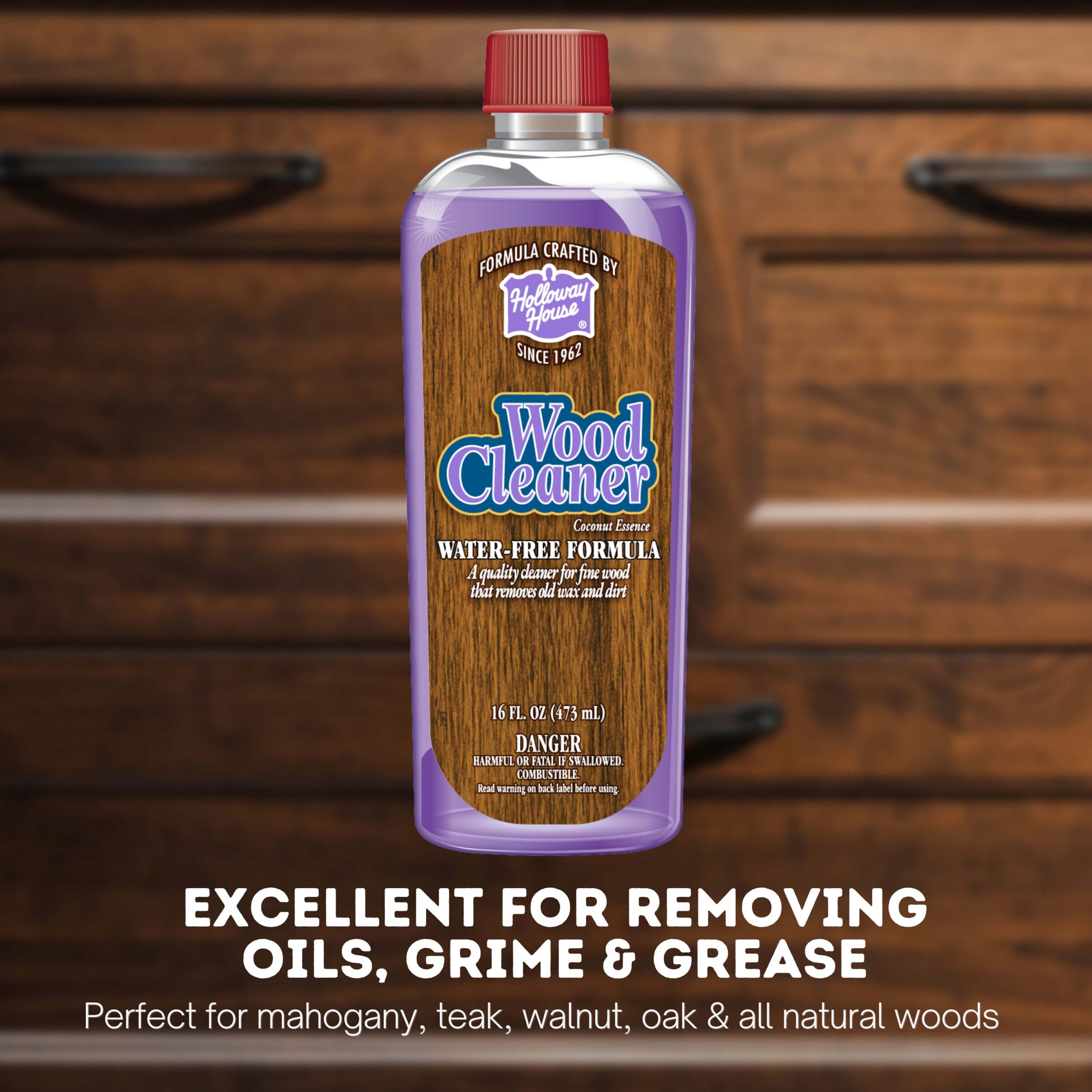 Holloway House natural Wood Cleaner is adept at removing stubborn stains, dirt, grime, and grease, leaving behind a lustrous shine that restores the natural beauty of your wood furniture and wood surfaces. Whether it’s cabinets, tables, or doors, our product is versatile enough to handle them all. Waterless, natural cleaner for fine wood. Cleans and protects.